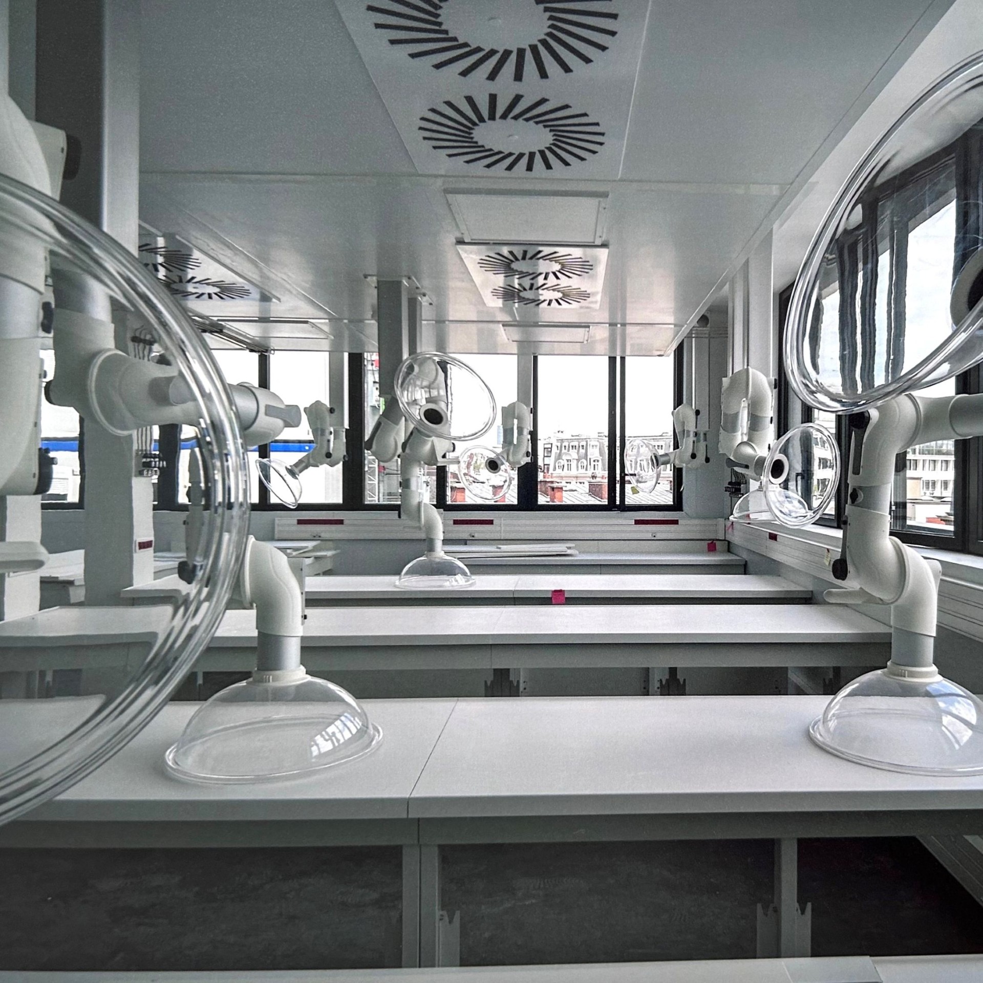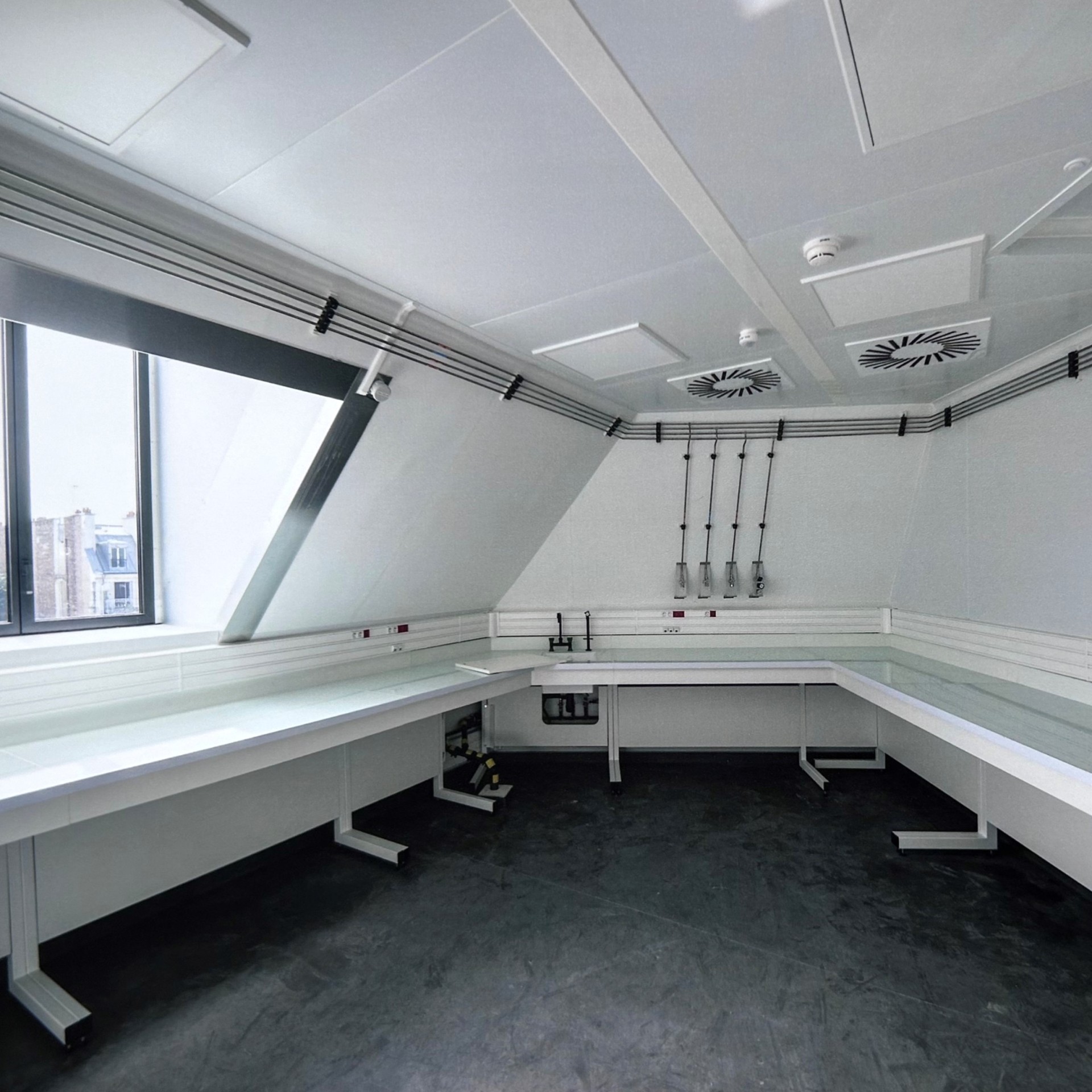 - Installation d’enveloppes de salles blanches (plafonds, cloisons, portes) dans plus de 90 laboratoires L2 et une maison pour animaux.
